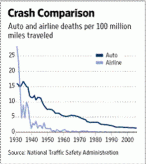 The MSM will not tell you that under deregulation air travel safety has improved over eightfold of what it was during the regulated years – 1.984 fatalities per billion miles flown in 1978 versus 0.230 fatalities in 2000-2005 interval (National Transportation Safety Board). Now suddenly the politicians and bureaucrats along with their MSM trumpets are trying to convince us that it is only the heavy hand of government that keeps the skies friendly – that today the competing airlines suddenly have no more incentive to continue making their flights safer with each passing year.
