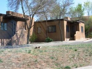 The city of Santa Fe is a planning department’s dream. Houses and buildings all have the same pueblo look to the point where it is past monotonous. I can imagine how thin and simple must be their architectural guide for buildings within the city limits. But the more interesting point is that this cookie cutter approach (aka architectural style) is followed over the entire countryside. Driving up from Albuquerque we saw community after I-25 hugging community composed of exactly the same type of houses – this went on for thirty miles. This dictum makes the capitol of the state almost disappear as seen from an overlook. The following pictures illustrate the imagination evident in the design of brand new and existing houses. The entire theme is picked up and replicated over the entire town as shown in the d