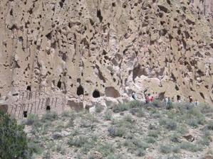 The trail is really very well done taking us along the wooded valley floor by giant kivas and circular condo type villages. Then the trail climbs high into the south facing cliff where more people lived in caves dug into the soft rock and in rows of attached housing built from stacked stones glued together with mud.