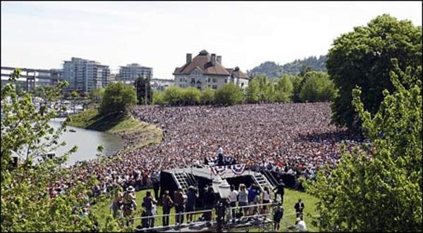 Democratic presidential hopeful Sen. Barack Obama (D-Ill.) speaks to people at Waterfront Park in Portland, Ore., May 18, 2008. (Associated Press)