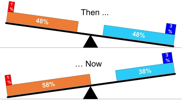 By the 1930s such voter communications became the grist of electioneering – all that it needed, according to the psychologists and statisticians, was money. For when you had money, and lots of it, you got the desired effect shown in the bottom part of the figure (percentages exaggerated, but not too much). In short, with sufficient media coverage you could overwhelm your opponent by causing a massive shift in the more or less mindless mass, and make the small fraction of intelligent voters irrelevant in the election.