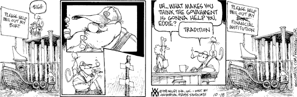 People are beginning to get the idea of the benefits of wealth redistribution.  Both candidates’ recovery package (aka The Big Bailout) includes some form of restitution for those whose financial planning went a little awry.  It’s just neighbor helping neighbor with five to twenty in the federal pen if you try to short your neighbor.  More of liberal cartoonist Wiley’s non Sequitor cartoons here.