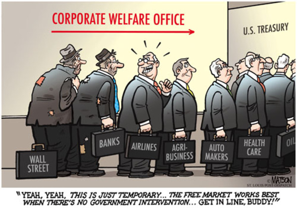 Through a combination of expert and patient lobbying, inflicted on greedy politicians of mostly middling intelligence, markets have been bent by governments for as long as history records. The American experiment has taken this dance to new heights of sophistication. The result is a system of corporate welfare set up through byzantine laws, not to help out businesses in dire straits, but to insure that ‘them that got will keep getting’. When we apply the above principle, the result is what we have today.