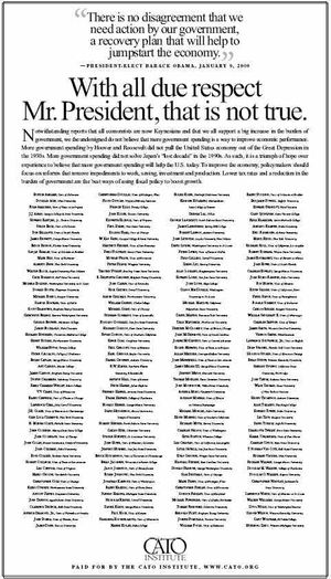 Cato reran their full-page ad in this morning’s WSJ (readable version) countering President Obama’s claim that “there is no disagreement” on this government plan (Full disclosure – Jo Ann and I helped pay for this ad. Actually, we’re proudly bragging.). When the liberals are questioned about the efficacy of the $820+ billion stimulus bill – what makes you think it will work? The instant response is ‘we can’t follow the failed policies of the Bush years, we must do something, and spraying money we don’t have across the countryside is the only thing we know to do’. The failed policies of the Bush years (and before) have now been dissected twenty ways from Sunday, most recently today by John B. Taylor, Stanford professor of economics, author, and senior fellow at the Hoover Institution, in the piece ‘How Government Created the Financial Crisis’. How the ‘failed policies’ response addresses the question of whether this stimulus plan will work is one of the many mind-boggling mysteries that are readily accepted by the sheep as gospel. Ready, fire, aim!