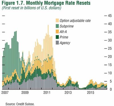 … it’s worth remembering that only 14% of mortgages outstanding are subprime. Most mortgages aren’t subprime. To be sure, a disaster in 14% of the market is a huge problem in and of itself. But this graph from Credit Suisse is the most sobering thing I’ve seen in a while. It shows that most of the interest rate resets ahead aren’t subprime, but are instead Alt-A and option-ARMs. Alt-A is the category of loans made to consumers with FICO scores just above the subprime threshold. Option ARMs give borrowers several payment options, including making a minimum payment that does not even cover the interest that accrued in the last month. This means it’s pretty easy for an option ARM to end up underwater, even in a market where prices are holding steady. If real estate prices are dropping, it is even more likely that an option ARM will end up upside down, which makes refinancing near impossible. The bulk of the Alt-A and option-ARM resets are coming in 2010-2011. A lot of things could change before then. But we might just be seeing the tip of the iceberg in the housing market.