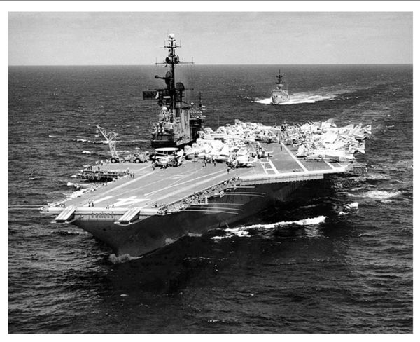 In going through the labyrinth of the Midway’s innards I was reminded of the enormous complexity that operating such a ship as the tip of a mighty spear which stretches from some hostile shore 12,000 miles from home, all the way back to the main streets of our towns and cities. To do its job in projecting power, the modern carrier and its complement of about one hundred combat aircraft requires a protective cordon of ships and submarines, and a logistic train that reaches back to the plants and factories in the very heart of our homeland.