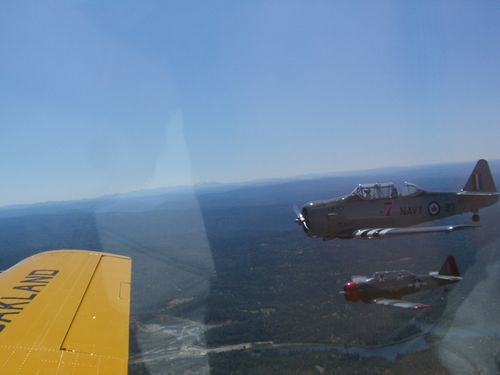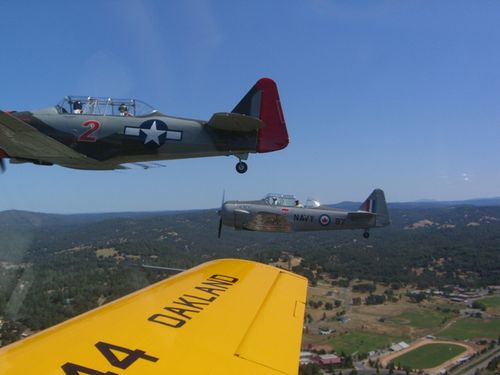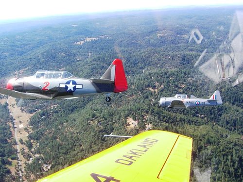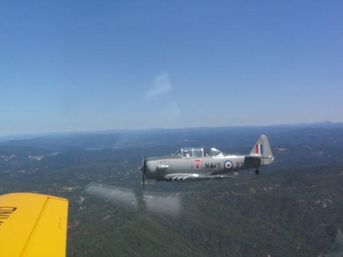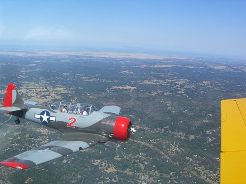 [6jul2009 update] Finally, Brian O’Brien flying second seat in the T-6 with Tom Dwelle piloting is the real aerial photography pro. He took the three pictures below. Now I know why his canopy was open during the entire flight, and he was leaning down when he wasn’t looking through the camera. Taking some serious moving air in the cockpit is the price you pay for excellent photography. Thanks Brian.