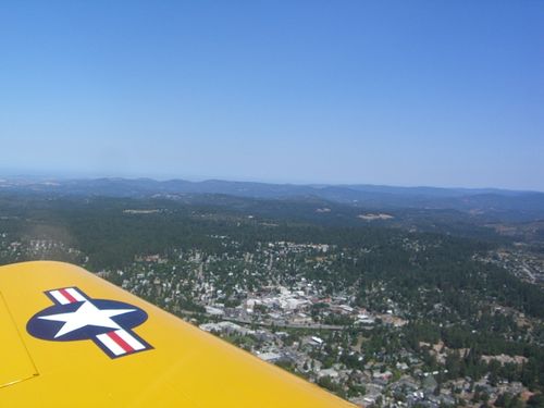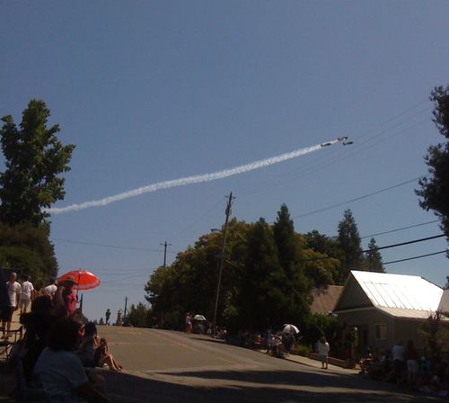 Now we were back over the Grass Valley/Nevada City area, and Jim was maneuvering us over the South Yuba so that we would make our first pass at 11AM, exactly when the parade was starting. As these things go, we nailed the time, missing it by only 17 seconds. After the first pass we wheeled around to the left, went back north, lined up and repeated the flyover. This time Jim pulled the knob that let a little oil into the hot exhaust manifold to create the stream of white smoke from MYT-6. Jim explained that you do the smoke on the second pass since that’s when everyone has their eyeballs peeled and their cameras ready. As I looked back, there was still a hint of our patriotic pollution hanging over town before the light airs of the morning dispersed it.