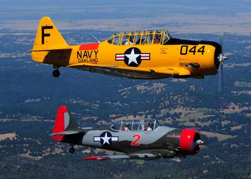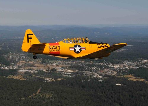Jim picked me up at 9am sharp and in no time we were at the Nevada County airport (KGOO) opening up Jim’s huge hangar. There sat the retired warbird, all shined up and ready for showtime. I say retired because the AT-6 had its first life serving as an advanced trainer of WW2 fame, the job it was designed and built for. The T-6s then passed into civilian hands as one of the most popular single engine airplanes ever and saw a second career in the air racing circuits around the country. Jim is also an ex-air racer, and now serves to train T-6 pilots in air racing and formation flying. In recent years he has served as the official starter for the T-6 races in Reno.