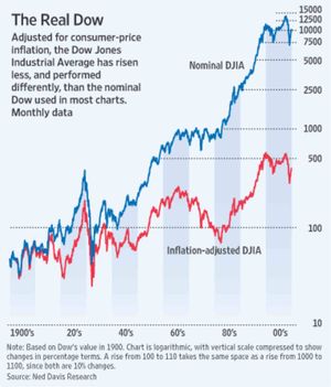 Today’s WSJ highlights the poor performance of the Dow Jones Industrial Average over the last decade when inflation is taken into account (here). Now, as students of economics, we all know that inflation is a monetary phenomenon in the hands of those who control the supply of our fiat money. And we also know that inflation is a purposive tax on dollar-based assets. The bottom line here is that we are not supposed to notice that we are taxed once by inflation, that reduces the real gains of our investments, and then taxed again on the nominal (not real) profits as we attempt to dig ourselves out of the current slump. Cynical is no longer the appropriate word for it.