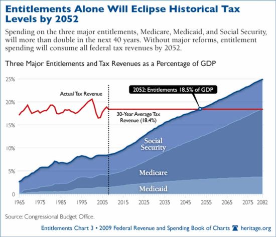 The coming explosion of entitlements is one of the publicized drivers of socialized medicine and its current embodiment as Obamacare.  The nearby chart from the Heritage Foundation plotting CBO data tells part of the story.  Historical tax revenues for the feds have been close to the underside of 20% of GDP.  If you project such average tax revenues and increase each of the three big entitlements as shown (presumably by the available national demographical data), then there is a point somewhere in mid-century where the entitlement payouts will equal all of the federal tax revenues.