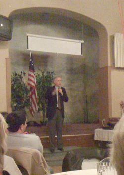 Tonight we made it to a gathering of the local Tea Party Patriots (aka teabaggers) in the Grass Valley Elks Lodge. I estimate that over three hundred of Nevada County’s rightwing extremists packed themselves into that hall. It was advertized as a celebration of the movement’s success here and across the country – fifteen million of us out there now. For cover, the TPP leaders had arranged for a band, no-host bar, free fat pills (aka desserts), four of the county’s Supes in attendance, and they even had Congressman McClintock there to speak. It would have fooled most people.