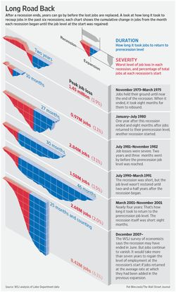 We live in pre-Singularity times. One of the harbingers of this is the creative destruction of jobs by accelerating technology. Looking at the Great Recession, as it compares to its lesser predecessors, we see that it is harder and harder to dig ourselves out of the unemployment holes created by these economic downturns (click on figure to enlarge). Businesses take advantage of these times to eliminate deadwood and reconfigure themselves into a more productive and competitive stance that always requires fewer people having upgraded skills. The governments at all levels seem to be immune to this, and are doing their best to take up the slack. However, that is not a good long-term solution.