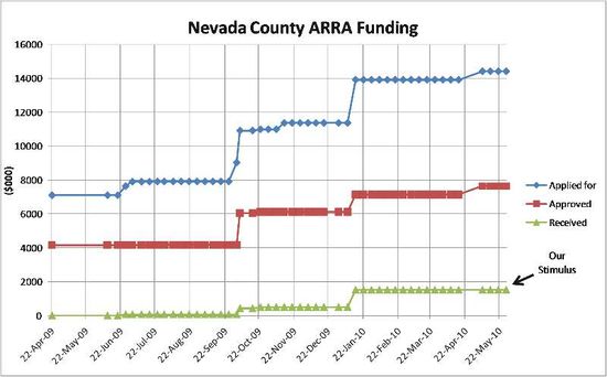 Looking at the above chart should make all of us, conservatives and progressives, feel proud that we in Nevada County are not contributing much to the national debt burden. In a year and half, we have only been given a skosh more than $1.5M of the American Redistribution and Re-election Act money. You remember that supercritical ARRA stimulus the one if it didn’t stimulate the country right then and there, over that particular weekend, well hell, we’d all be up a creek without a paddle. Now more than a year later, it turns out that the Chief Community Organizer was just joshin’.
