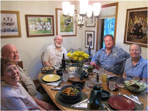 The accompanying picture taken by Jo Ann shows the layout a moment before we got our fingers greasy. A careful inspection will reveal that platters of both fish have somehow wound up within easy reach of your faithful commentator. My, oh my, those critters did not die in vain. Thank you Dixon!