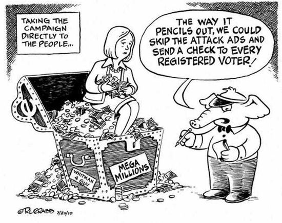 Looking at Meg sitting there, and all the various stimulus and spending programs that continue to come our way, the thought occurred that maybe there is a telling difference between Republican and Democratic candidates.  The Republicans tend to buy your votes with their own money.  And the Democrats tend to buy your votes with your own money.