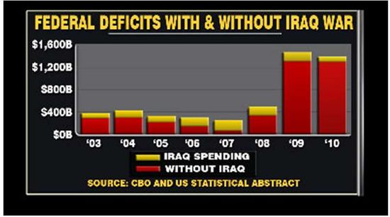 The picture of the deficits over the last eight years is a telling story.  The graphic shows the deficits with the cost of the Iraqi war broken out as tallied by the US government.  For those keeping up, we have to add the shown amounts to about another $3 trillion dollars to come up with the total federal budget.