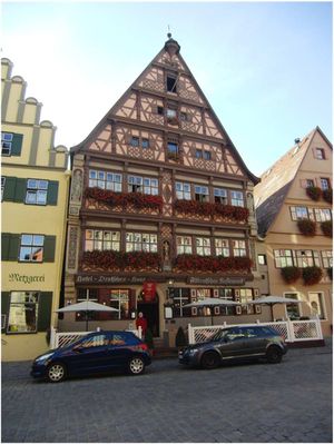 Dbuhl2 Jo Ann had booked us into the Deutsches Haus hotel right across the wide cobblestoned plaza from the cathedral (photo on left).  The building, built in 1440, was straight out of a Hollywood back lot set for a Renaissance movie, but then so was the whole town.  It was built without an elevator, and for the last five hundred or so years no has seen any reason to add one.  Our room was on the third floor.  After recovering from the Hauling of the Bags ceremony, we became typical tourists and took the usual gawking walk with camera and wallet firmly in hand and ready to deploy at a moment’s notice.  We stayed there two days, great fun.