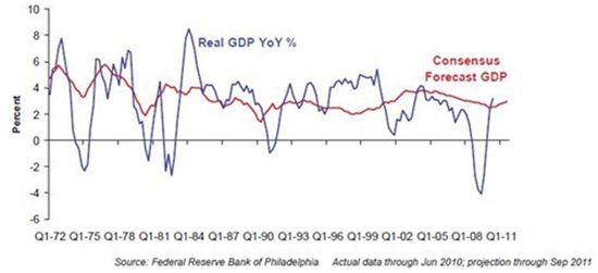 “However, attempting to invest on the back of economic forecasts is an exercise in extreme folly, even in normal times. Economists are probably the one group who make astrologers look like professionals when it comes to telling the future. Even a cursory glance at (the chart above) reveals that economists are simply useless when it comes to forecasting. They have missed every recession in the last four decades! And it isn’t just growth that economists can’t forecast: it’s also inflation, bond yields, and pretty much everything else.” (Original emphasis.)