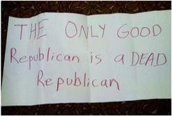 I attended multiple tea party events (protests?) to voice my disdain for republican spending (I expect spending from the dems). I read hundreds if not thousands of banners, billboards, signs, t-shirts; not one of them threatened the life of a politician. The liberals labeled the TP movement as radical and fringe… what do they label the death threats, thuggery and pure evil coming from the left?