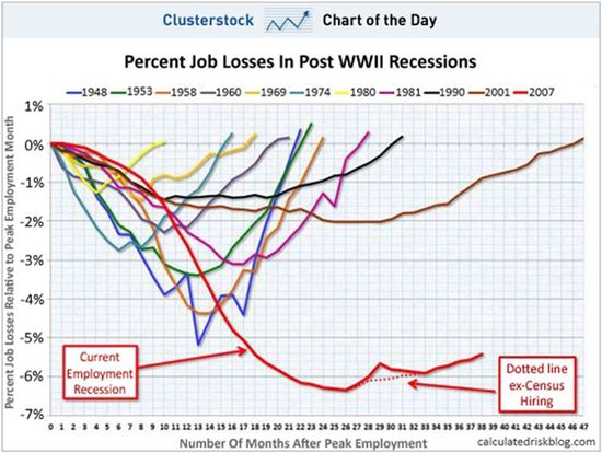RR readers know that I am of the Austrian persuasion (Mises and Hayek) when it comes to economic theory and government policy.  Mises’ famous advice to governments seeking to repair recessions – “Do nothing, sooner!” – was first borne out in the Great Depression.  In the recessions since, the dictum has garnered additional support.  This is nowhere illustrated better than the above graphic from calculateriskblog.com (H/T to RR reader).  Here we see the extension of recessions as the feds have started to ‘help’ out.  And, of course, the poster child of them all is the current Great Recession that is on its way to becoming Great Depression Two