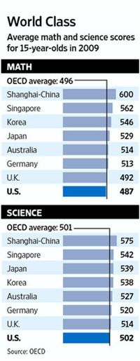 MathSciScores2009 Last night I was at Bear River High School presenting some scholarships from SESF (TechTest) and the Nevada City Rotary Club on their annual awards night.  And last week SESF presented the major tranche of TechTest2011 merit scholarships to Nevada Union High School seniors.  These scholarships continue to support young people headed for technology careers.  The daily news reminds us again that we are in dire straits as nation when it comes to supplying wealth creating workers.  Thanks to the new politically correct curricula promoted by leftwing teachers’ unions, we have been turning out dumber students in mostly ‘meathead majors’.  Industry is again beseeching our school systems to turn out workers with skills needed in the American workplaces (see ‘Industry Puts Heat on Schools to Teach Skills Employers Need’ in the 6jun11 WSJ), and progressive organizations like the NAACP continue to throw their weight against the kids who are most disadvantaged (here).  The nearby graphic illustrates the competitive slide of US students compared to students in other OECD countries.