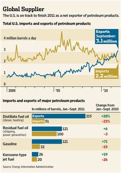 NetOilExporterIt isn’t clear whether we should laugh or cry.  But here we are, for the first time since 1949 we will be a net exporter of petroleum products this year.  The accompanying figure filched from the WSJ shows that exports started increasing during Bush2’s reign (recall Bush2 was an oilman).  Unfortunately, our exports are exceeding our imports because our economy has tanked, and is still mired in the mud (more here).