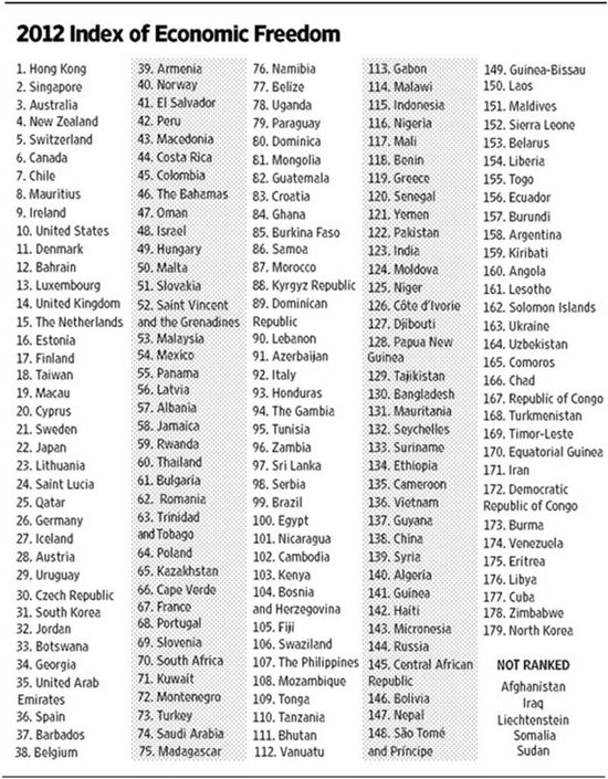 In the meanwhile, we are proud to announce that on 1 January 2012 the country added over 40,000 new laws and regulations to further corral our liberties, and our government’s spending now amounts to about 40% of GDP. The Left has plans to drive this wealth killing percentage even higher as the economy declines. A summary of the Economic Freedom Index is found in the 12jan12 WSJ (source of filched table above), and an excellent interactive report on the rankings and ratings is available on the Heritage website here. WSJ and the Heritage Foundation generate this index annually.