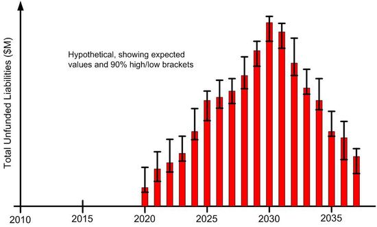 Added to the above calculations we have at least one “side fund” and yet to be explained amounts of monies due that are not shown on the county’s financial statements. The situation is murky indeed, and our electeds are not exactly leaning forward to clear up the obligations that are facing us. What I would like to see is a chart like the one below that shows by year Nevada County’s total known and anticipated obligations with error brackets showing the high-to-low range.