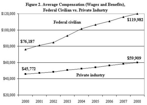 Also, Mike McDaniel, author of the above Union piece, posted a comment below that links to a Cato Institute graph that compares the average of total benefits received by federal and private sector civilian workers. This graph is reproduced below.
