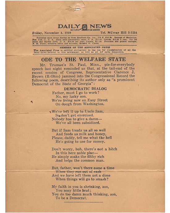 A reader sent me this little blast from the past, published in the year I first set foot on these shores. The ode below was composed as it became clear that the nation’s flirtation with communism in the Great Depression had not been fully purged by Truman’s partial efforts to sunset some of the more egregious New Deal programs after WW2.