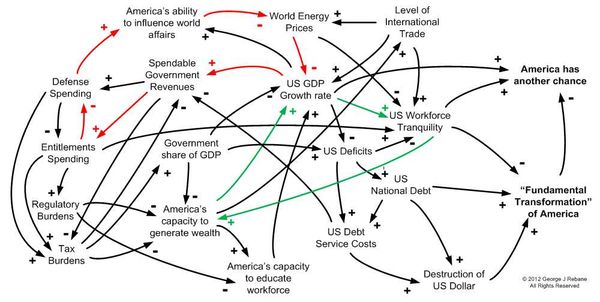 When thinking about the upcoming election in the context of national issues and all that is going on which affects America, things get complicated pretty quickly.  An established tool for representing, sorting out, and communicating such factors and their interaction is called the Influence Factors Diagram (IFD).  An IFD is usually involved in the first steps of laying out the design of a system or process.  It is conceptually extremely simple, even corporate management and (a few) politicians can deal with it.  Lawyers hate them for their uncompromising clarity.  For the intelligent reader – the ones I fantasize who frequent these pages – reading an IFD is a slam dunk.  (I first introduced IFDs here.)