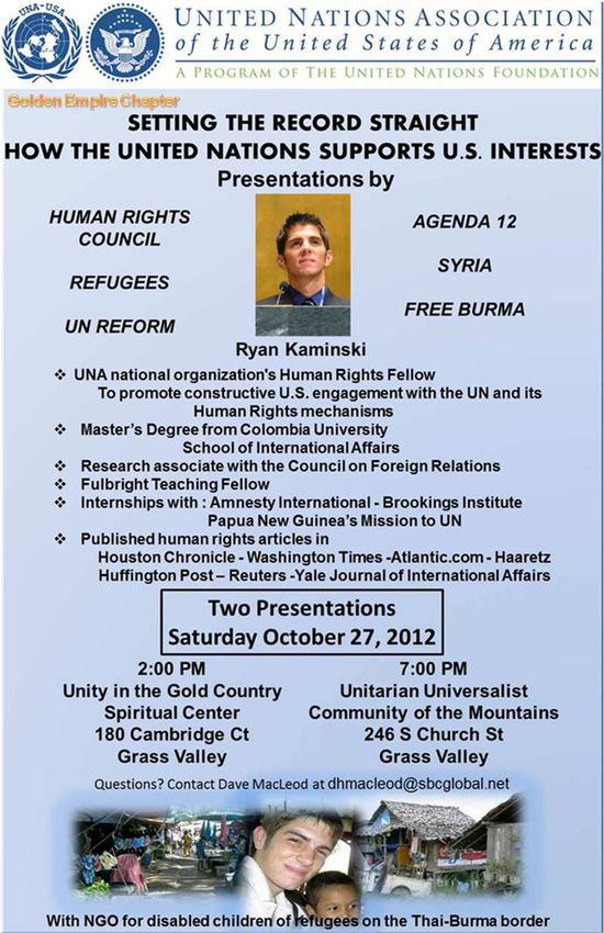 2. Come to Setting the Record Straight. Join Human Rights Fellow, Ryan Kaminski, and celebrate UN Day. Learn about the U.S. Interests in UN Reform, Agenda 21, Syria, Refugees, Free Burma, and the recent outcomes of the Human Rights Council session. Kaminski is a world class speaker you can relate to and get answers.