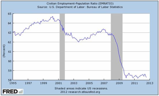 [30nov12 update] The following graphic from the St Louis Fed is a devastating underline to the systemic unemployment picture I have been painting for the last several years. The employment curve will not recover much because of technology abetted productivity increases and insane government policies that minimize entry of useful immigrants while at the same time, as argued above, driving existing jobs overseas.