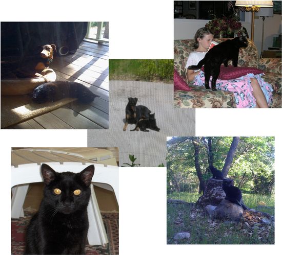We had begun favoring black cats because they always had the best personalities, and their color helped them survive, especially at night when they just ‘disappeared’.  Leo’s great temperament helped him raise two dobies during his long years.  The first one, Neiu (‘nay-you’), arrived when Leo was almost a year old.  Right away Leo showed Neiu the ropes and made sure she knew who was boss.  The two of them settled into a close friendship that lasted all of Neiu’s twelve years, they did everything together (see picture) from rough and tumble play to serene moments on the driveway.  The indelible dog/cat play rule at our house has been that the dog never uses her paws – powerful and poorly controlled – and only her mouth – extremely well controlled.  And Leo was very careful with his claws around Neiu’s eyes even when his head was in her mouth.