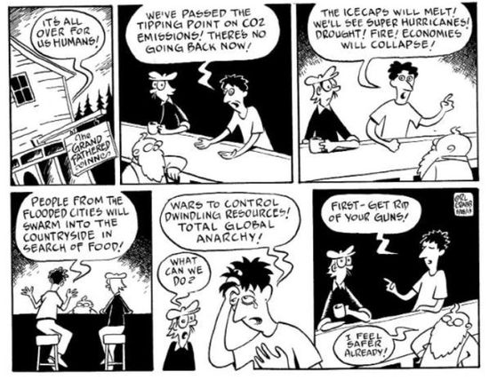 The transportation alone of the clothes the liberal is wearing, the drink they are ordering, the electricity used in the watering hole itself are part of the unsustainable system they are worrying so much about on top of your key issue. It is going to take a collective consciousness to nip this in the bud. We we all be long gone before we will see the shifts take place. It will be incremental unless a cataclysmic event takes place and then those of us who have reducing and getting our ducks in a row will have a easier time through the transition.