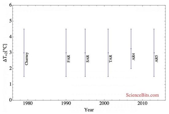 When a theory, especially one with political consequences, is exercised, tweaked, and patched for over thirty years, and the reported output error bounds stay essentially constant, then something beyond fishy is going on.  Shaviv offers that such a graph points to something more than incompetence in the teams of investigators, or even that they are “captives of a wrong conception”.   I will draw a much stronger conclusion from the data in that graph and the history of the IPCC enterprise.  I believe that the suspiciously constant temperature error bounds reported from billions of dollars of ‘research’ spent over thirty years are prima facie evidence of conspiracy and scientific fraud.