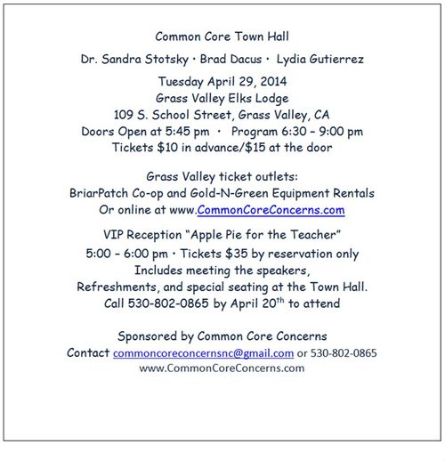 Common Core. Switching gears to the plague now afflicting the nation’s K-12 curriculum, there will be a town hall meeting on the subject here in Grass Valley on 29 April 2014 at the GV Elks Lodge. Jan Collins (530-802-0865) is chairing the event and states that “there is growing grassroots opposition nationwide to the new one-size fits all curriculum, and its accompanying testing and collection of invasive personal data about our children and their families. Home schools, private, and charter schools may find they are affected as well.” Anyway, mark your calendars and come hear the speakers, and get the latest info on what all the fuss is about; it’s important. More about Common Core here and here.