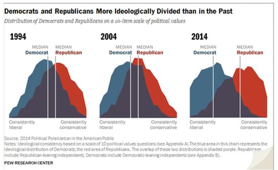The non-partisan Pew Research Center has just concluded an extensive research project – ‘Political Polarization of the American Public’ – on the depth and extent of the country’s polarization, asking whether the dysfunction of Washington is reflected across the land, and what has become of the usually functional ‘center’ that has directed the nation’s governance.  Well, it turns out that the percent of voters who are consistent and adamant about their political views has more than doubled during the last 20 years – from 10% to 21%.  And more than twice as many in each of the two parties believe the other party is a salient and destructive force taking the country in the wrong direction while “posing a threat to the nation’s well-being.”