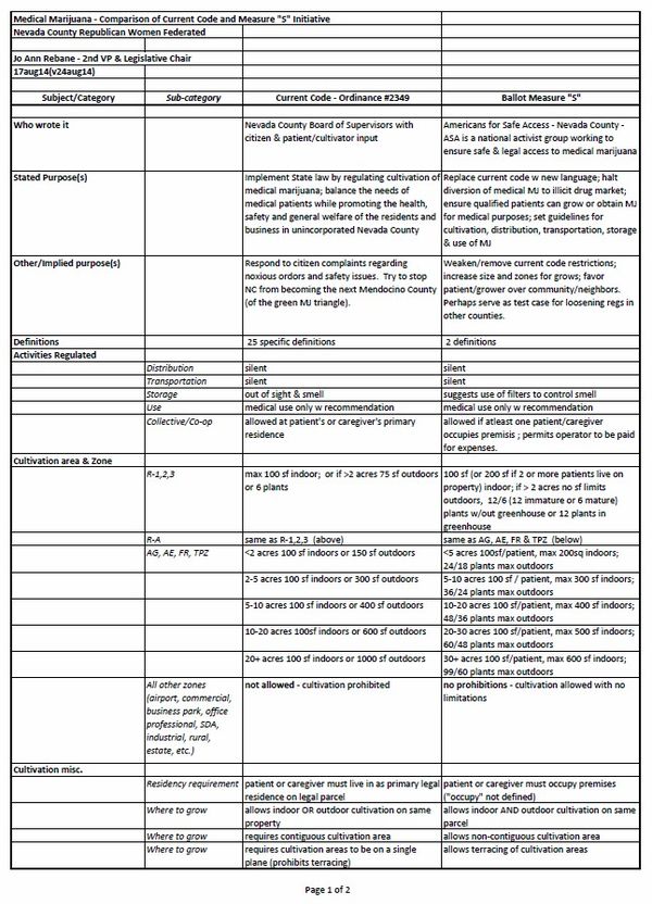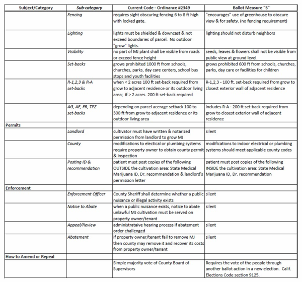 I have made a detailed comparison of the current medical marijuana cultivation ordinance and Measure S. It is available on our website as a printable pdf www.nevadacountyrwf.org .