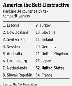 Any day now the White House and Sen. Charles Schumer (D., N.Y.) will attempt to raise taxes on business, while making the U.S. tax code even more complex. The Obama and Schumer plans to punish businesses for moving their legal domicile overseas will arrive even as a new international ranking shows that the U.S. tax burden on business is close to the worst in the industrialized world. Way to go, Washington. … On Monday the Tax Foundation, which manages the widely followed State Business Tax Climate Index, will launch a new global benchmark, the International Tax Competitiveness Index. According to the foundation, the new index measures “the extent to which a country’s tax system adheres to two important principles of tax policy: competitiveness and neutrality.” (chart filched from the article) – gjr]