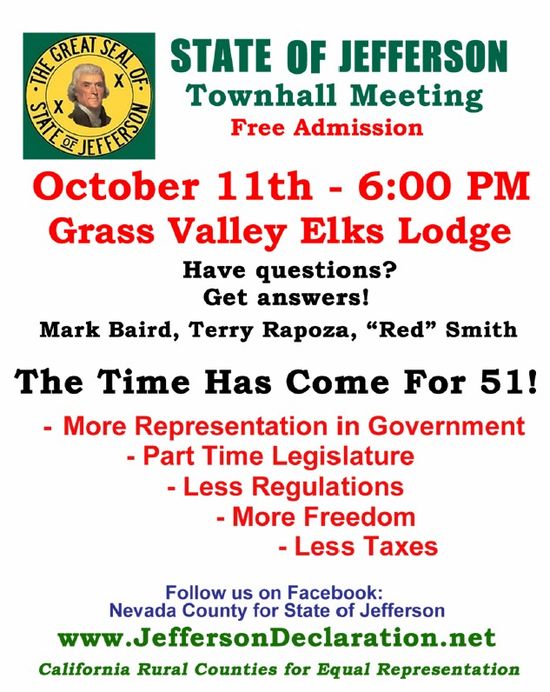The State of Jefferson movement continues along, and our Nevada County chapter of it is holding a town hall event this coming Saturday night (see below). Remember, the SoJ movement also gives those who feel that the northern counties have no representation in Sacramento an opportunity to leverage their voice – to attend and/or support the movement you don’t have to be convinced that the movement will succeed (yet), only that your voice will be heard in Sacramento. Give it a look.