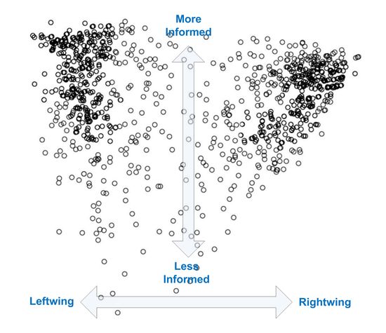 In his How Not to be Wrong – The Power of Mathematical Thinking (2014) Jordan Ellenberg serves up a powerful graphic that documents how our current ideological spectrum divides itself on the Right/Left vs More/Less Informed plane (see figure). The data points are generated from “a political survey taken by Public Policy Polling on December 15, 2011; there are one thousand dots, each representing a voter who responded to a twenty-three question poll. The position of a point on the left-right axis represents, well, left and right: people who said they supported President Obama, approved of the Democratic Party, and opposed the Tea Party tend to be on the left-hand side, while those who favored the GOP, disliked Harry Reid, and believed there is a “War on Christmas” are over on the right. The vertical axis stands roughly for “informedness”— voters toward the bottom of the graph tended to answer “don’t know” to more insidery questions like ‘Do you approve or disapprove of the job [Senate Minority Leader ] Mitch McConnell is doing?” and to express little or no excitement about the 2012 presidential election.’”