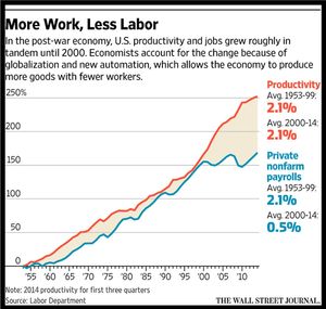 Productivity_JobsRobots will ultimately take your job, and give no guarantee to create another one that you can or are willing to do.  That realization is even reaching the high towers of learning at government funded MIT Artificial Intelligence Labs.  There a conclave of the country’s leading AI and robotics researchers meet monthly to discuss such matters.  Heretofore, they and other such groups have been regularly issuing the pabulum that ‘not to worry, technology’s advance will create at least as many new jobs as the old ones it makes redundant.’  Well, that considerable bit of fiction hasn’t proved to be true in the recent past, and will continue to contribute to systemic unemployment with every passing year.  But RR readers have known that for a long time now.