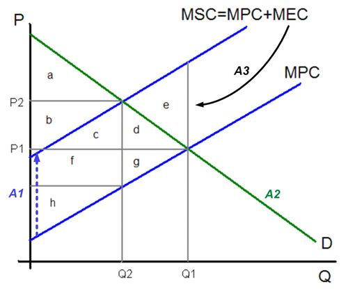 Now enters agent A3 who is neither a producer nor consumer, and he determines that there are people out there negatively impacted by such production/consumption transactions. By fiat A3 (usually the government) has the power to assess, attribute, and allocate what it determines is the โsocial costโ of such unhampered transactions. It attributes such a cost to a given industry (economic activity) and, in its wisdom, allocates a portion MEC (marginal external cost) to A1 โ as a tax, tariff, license fee, imposed purchase of, say, carbon credits, etc โ that A3 claims is a negative externality. But in reality A1 experiences MEC as an added cost of production to his existing MPC (marginal private cost) of production. This yields a new MSC (marginal social cost) production curve experienced by A1. And the new price point now shifts to P2 at which price A2 is willing to buy only quantity Q2. (See my modified figure below from Environmental Economics.)