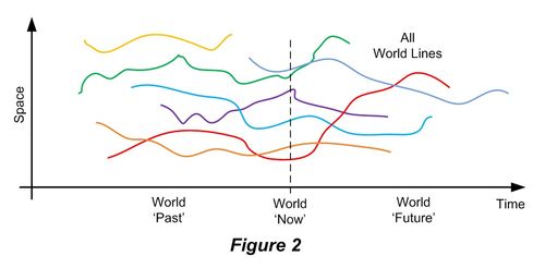 [Addendum] We can view the past schematically as a temporally sequenced collection of uncountable myriads of events, each one occurring when two or more worldlines (also world lines) cross or touch. The figure below illustrates (figure from ‘Does God Watch Paint Dry?’)