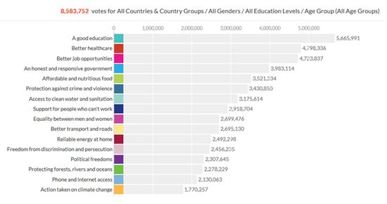 [Addendum] The UN has been conducting a survey of what issues and concerns are most important to the peoples of the world. The UN My World survey is ongoing and today exceeds over 8M repondents โ you can enter your own responses by following the links from the UN website. The big news for progressives should be that โaction taken on climate changeโ again falls dead last in what the worldโs people want (see figure below). As the breakdown of results show, this sentiment is common across broad classes. Yet the globalist elites continue to feel that of the list of more highly rated concerns, PGW still wins out as the preferred hysteria that can be used to mollify the public when draconian laws and regulations come down the line to contract their liberties, make them materially poorer, and reduce/eliminate opportunities for a better life.