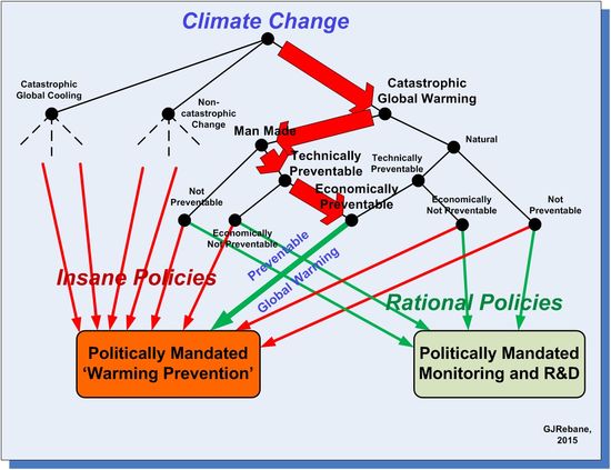 [This is the linked and addended transcript to my regular KVMR commentary which will be broadcast after the evening news on Monday 23 November 2015. Appended is a graphic detailing the chain (thick red arrows) of valid propositions forming a sane preamble for making preventable global warming public policies. There is little hope that sanity will be a prerequisite to the UN’s Agenda21 deliberations in Paris.]