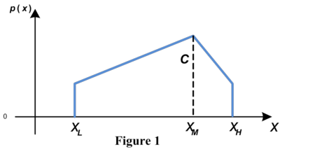 The confidence value C relates to XM, the most likely or best guess value. The closer C is to unity or one, the more peaked is the MAB at XM, and the closer C is to zero, the flatter is the ‘roof’ of the house-shaped PDF. At C = 1 the MAB assumes the shape of a triangle PDF, and at C = 0 it becomes the well-known uniform or ‘boxcar’ (rectangle) distribution, and essentially ignores any best guess value (see Figure 3).
