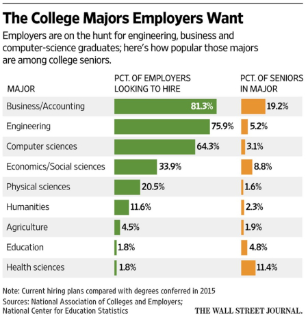 College grads of 2017.  The good news is that enough workers have retired, been laid off, or just left the work force that is this “another healthy year for college hiring” report in the 25apr17 WSJ.  The bad news is that “this year’s job-seeking seniors are ill-prepared for the job hunt and many coveted positions”.  The chart below tells the story.  It’s clear that employers overwhelmingly want people who have some skills that can translate into delivering marketable products/services.  And it’s also clear that too few students want to major in fields that are needed in the wealth creating enterprises when schools denigrate capitalistic pursuits and hold out government and feel-good NGOs as the professional destinations of choice for correctly thinking people.  Note also that the percent of seniors in that pretty broad spectrum of creditable major fields totals only 58.3%.  The question that begs an answer is, ‘What in hell did it say on the degrees of the other 41.7% of graduating seniors?’